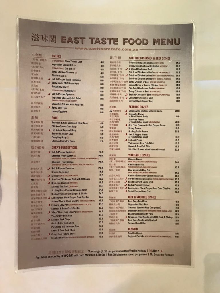 East Taste Cafe in Adelaide offers a diverse and flavorful menu that caters to a wide range of tastes. The Duck and Pork section stands out with indulgent choices such as Garlic Butter Pork ($21), Smoked Tea Duck ($23), and Vinegar Dry Pork Ribs ($22). The Seafood options are equally impressive, with standout dishes like Xo Seafood ($24), Eshand Prawn ($26), and Sweet & Sour Fish ($22), offering a variety of textures and bold flavors.